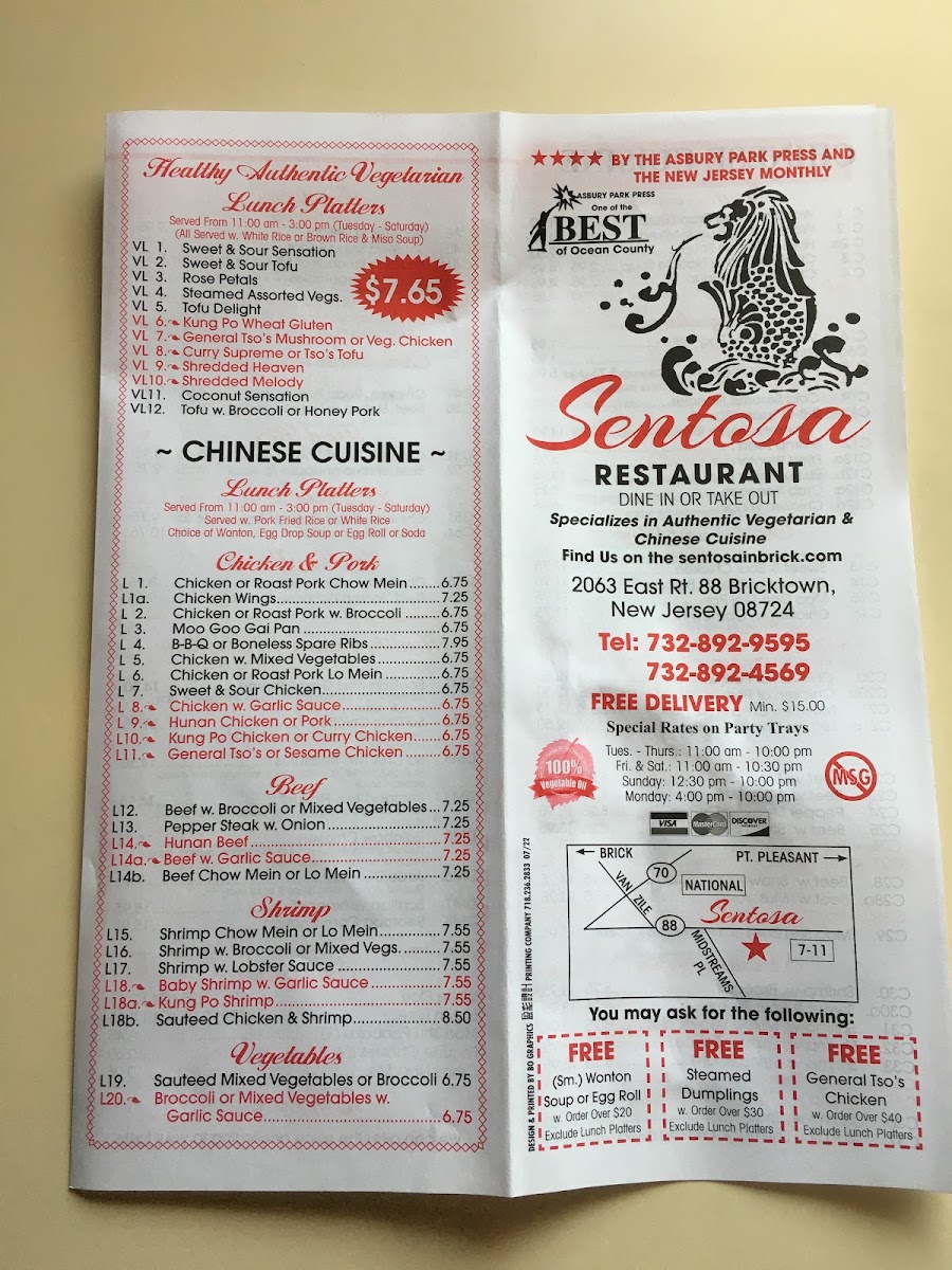 Sentosa’s menu offers a balanced and inviting selection of Chinese dishes with a thoughtful focus on vegetarian options, making it suitable for a variety of dining occasions. Whether you’re seeking comforting, familiar flavors or exploring plant-based choices, the menu serves up hearty meals that pair well with the relaxed and welcoming atmosphere of the restaurant.